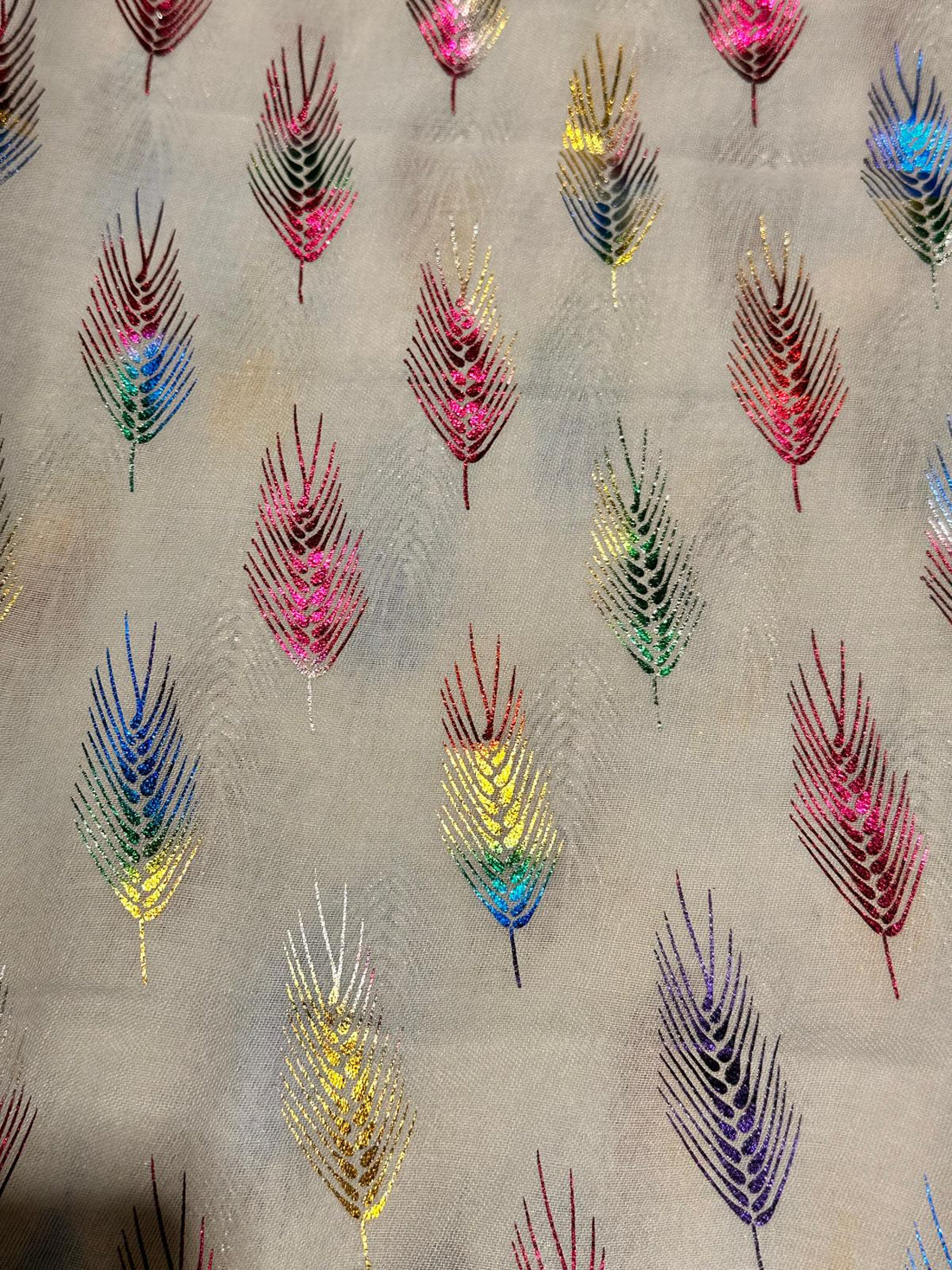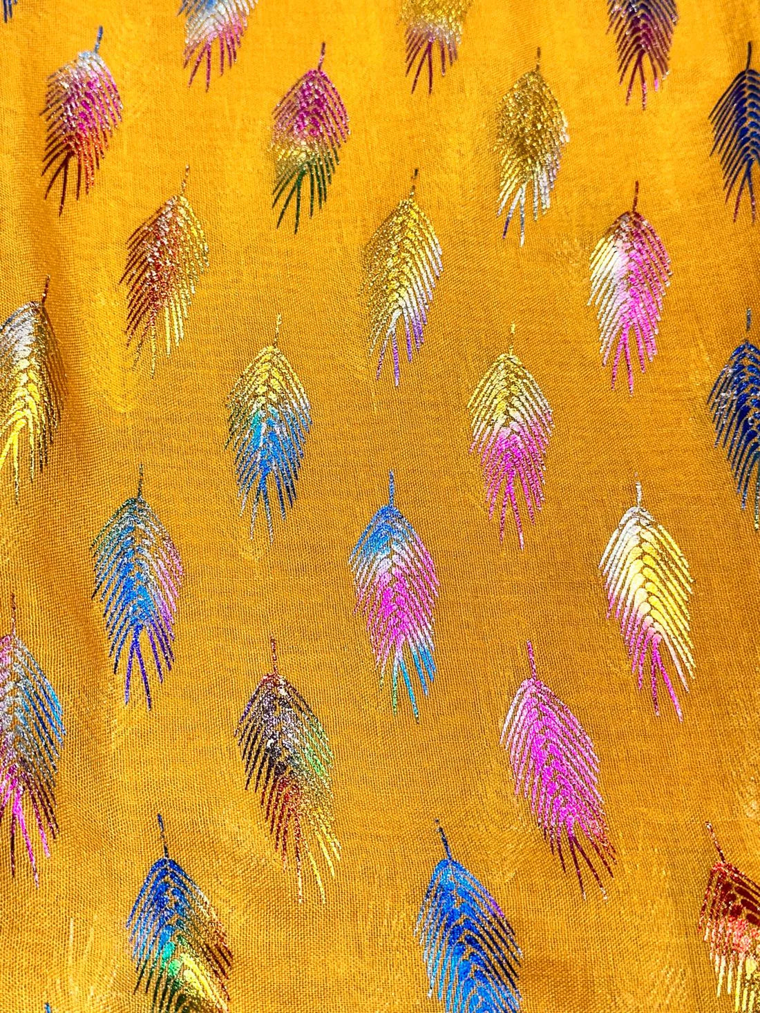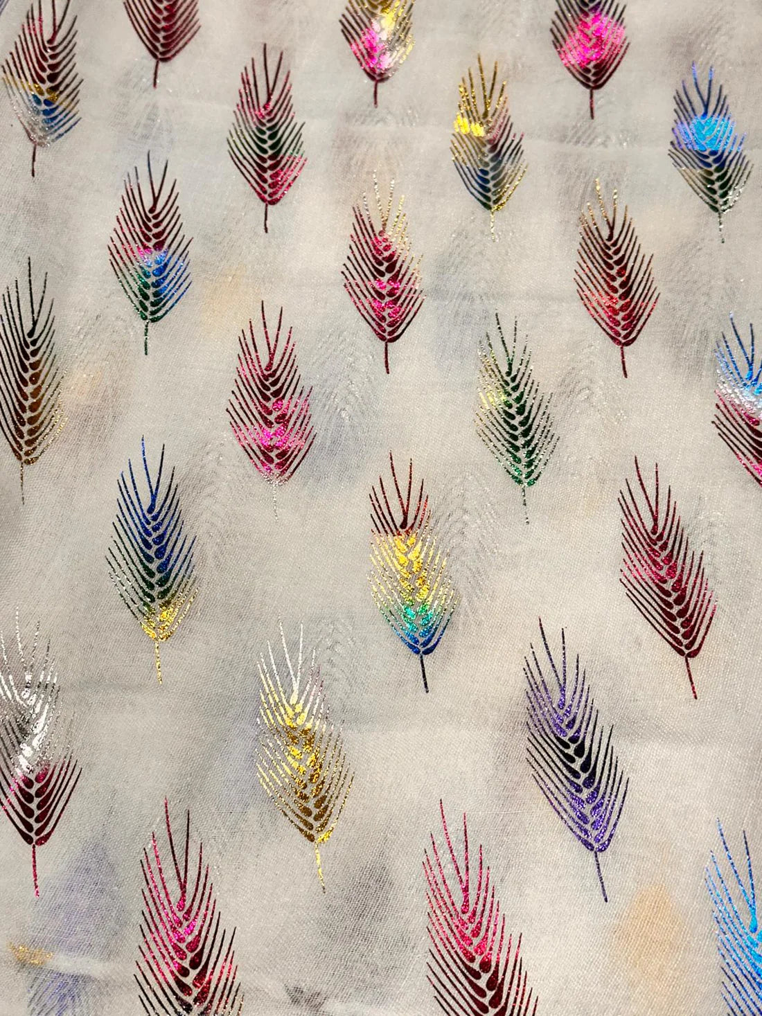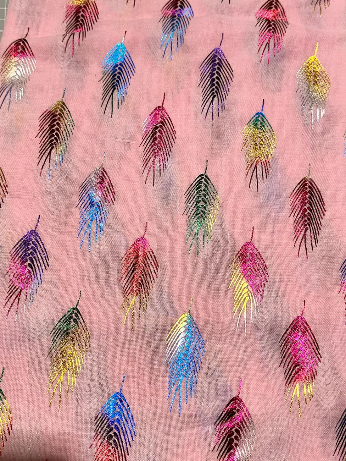 Rainbow glitter feather print scarf.